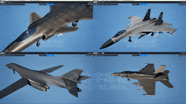 汇聚中外现役主力机型,战斗机覆盖重型、中型及隐身战机谱系,包括中国 歼-35、歼-20、歼-15等,美国F-35A 、F-22,俄罗斯 Su-35、法国幻影2000 等。模型精细还原气动布局与航电特征,支持超音速巡航、过失速机动、电子对抗等典型任务模式仿真。轰炸机突出远程打击与战术支援能力,提供如 美国 B-1B、俄罗斯Tu-160等机型,支持战略轰炸、防区外打击等作战场景构建。