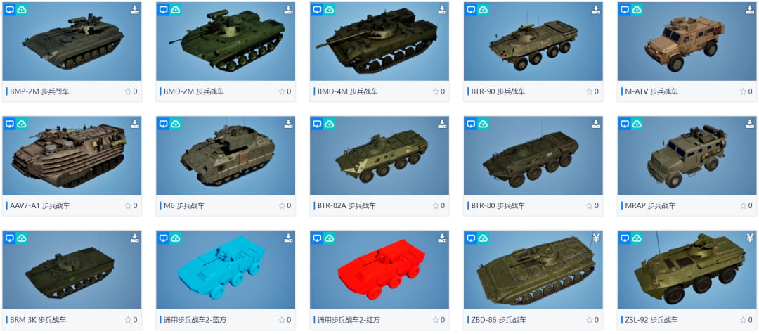 图观商城的步兵战车模型板块,集结了全球多军事强国的经典与特色装备数字模型。包含 我国 ZBD - 86、ZSL - 92、ZBD - 04 等主力步兵战车,苏联 / 俄罗斯 BMP - 2M、BMD - 2M、BMD - 4M 伞兵战车,以及 BTR - 90、BTR - 82A 等轮式步兵战车与 BRM 3K 侦察战车;美国 AAV7 - A1两栖突击车、M - ATV 防地雷反伏击车、MRAP 装甲车。