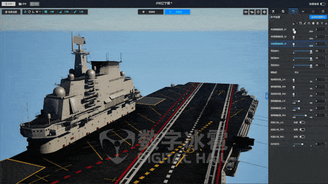 更重要的是,我们运用模型编辑器对航母上的各类关键功能装置进行了深度的关节编辑与数据驱动接口预置,使其从一座静态的钢铁巨岛变为一个可动态响应的智能孪生体: