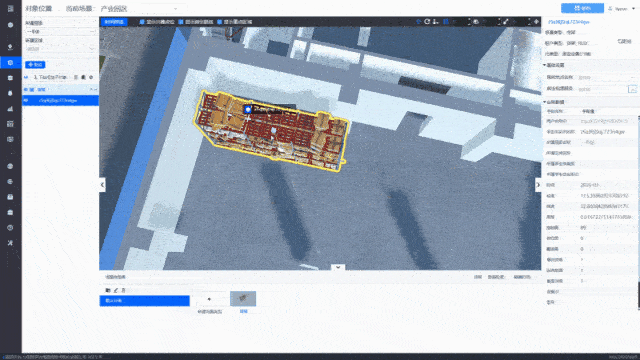 精准调整: 选中场景中的任一货架实例,右侧会弹出其实例配置面板。除了显示其基本信息(所属场景、元类型等)外,还提供了强大的交互工具:所有通过图形界面进行的调整,其数值都会实时同步到右侧面板的对应字段中(如经纬度、高程、缩放值等),实现了可视化操作与数据记录的完美统一。