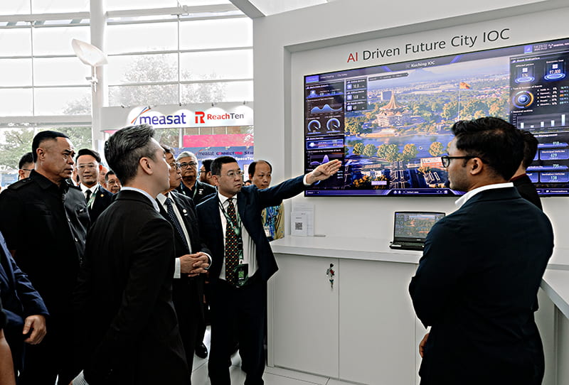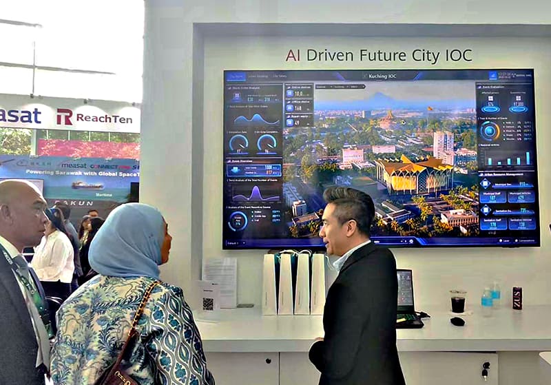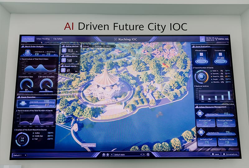 在联合展台上,数字冰雹与华为共同展示的智慧城市 IOC 应用 成为了瞩目的中心。该平台以高精度、全要素的数字孪生技术为核心,1:1复刻了砂拉越的城市风貌、基础设施与动态运行数据,构建了一个虚实映射、实时交互的“城市数字体”。