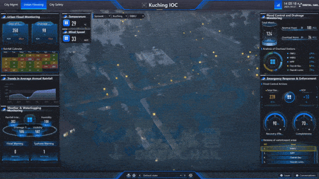 砂拉越地区雨季降水集中,内涝防治是城市安全的重要一环。数字孪生 IOC 能够接入实时气象数据、水文监测数据,并结合城市地形、管网模型,能够动态模拟 暴雨情况下城市各区域的积水情况、淹没范围与演进趋势。这不仅能帮助相关部门提前发布预警、调度排涝资源,更能为城市排水系统的长远规划与改造提供科学依据。