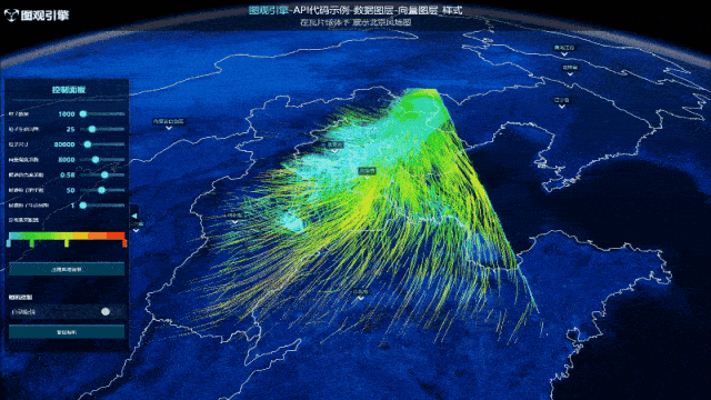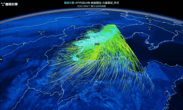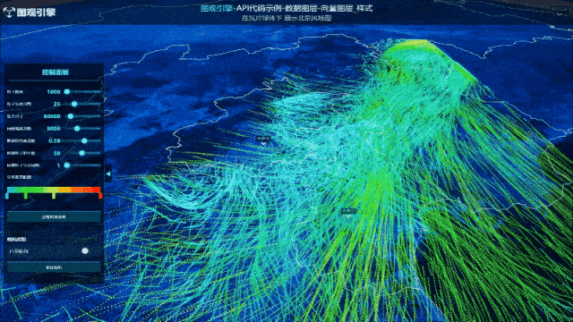 我们在以 “瓦片地球” 为基底的三维数字地球上,呈现北京及周边(经纬度:113.4°E~119.9°E,35.9°N~42.7°N)、高程跨度近千米 范围内的动态风场,成功实现了基于真实数据流的超大规模风场数据的实时、动态可视化。