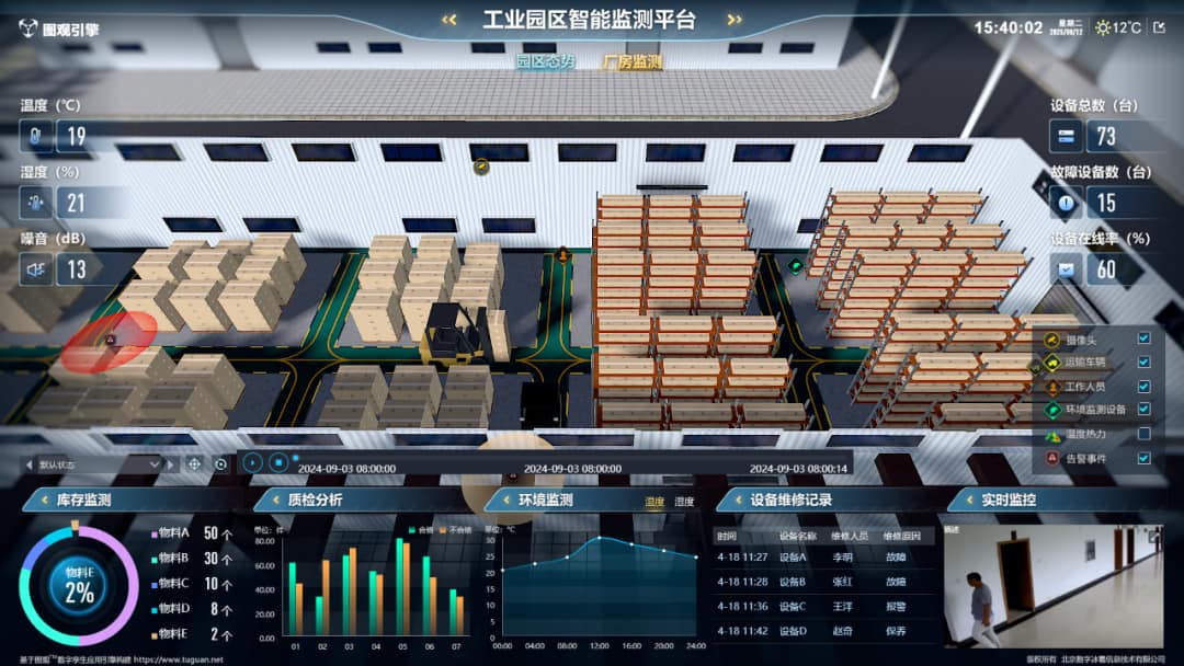 在本数字孪生应用中,基于图观模型编辑器制作的各个管理实体三维模型不再是静止的美术资产,而是能够随数据变化而动态响应的“活”的孪生体。
