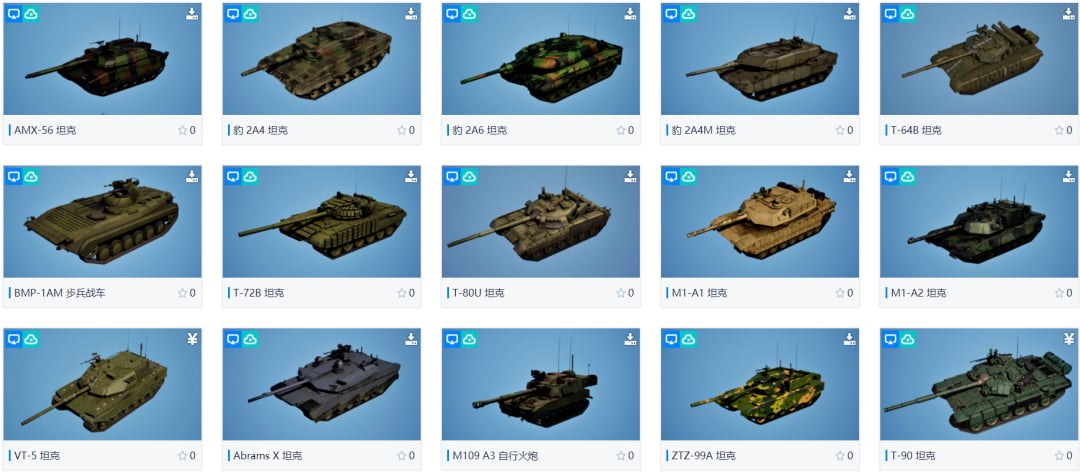 图观商城的坦克及陆战装备模型板块,汇聚了全球多国的经典与先进装备数字模型。其中,坦克型号覆盖 我国 ZTZ - 99、ZTZ - 96、VT - 4、VT - 5 等,法国 AMX - 56 坦克;德国 “豹” 系列 2A4、2A6、2A4M 坦克;苏联 / 俄罗斯的 T - 64B、T - 72B、T - 80U、T - 90 坦克;美国的 M1 - A1、M1 - A2、M1A2 SEP V1 坦克,以及新一代 Abrams X 坦克。