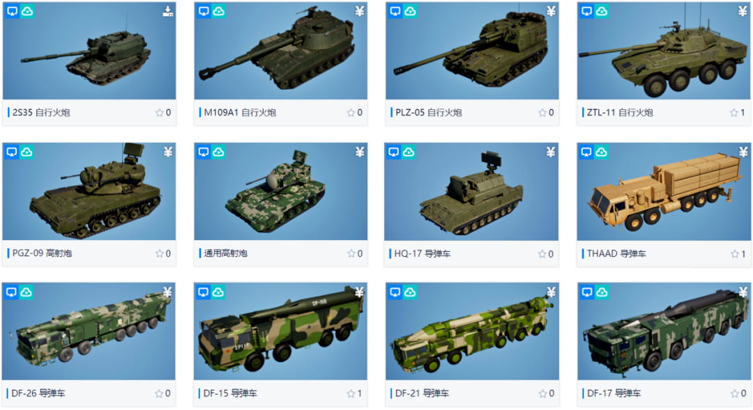 图观商城的导弹车与火炮类模型板块,汇聚了多型战略 / 战术导弹及地面火力装备的数字模型。火炮类 包含俄罗斯 2S35 自行火炮、美国 M109A1 自行火炮、我国 PLZ - 05 自行火炮与 ZTL - 11 轮式突击炮,还有 PGZ - 09 自行高射炮、通用高射炮 等。导弹车 涵盖 中国 DF - 26、DF - 15、DF - 21、DF - 17 等弹道导弹车,HQ - 17 防空导弹车,美国 THAAD 反导系统车,以及 XF - 2、BMPT - 72 等特种导弹车。