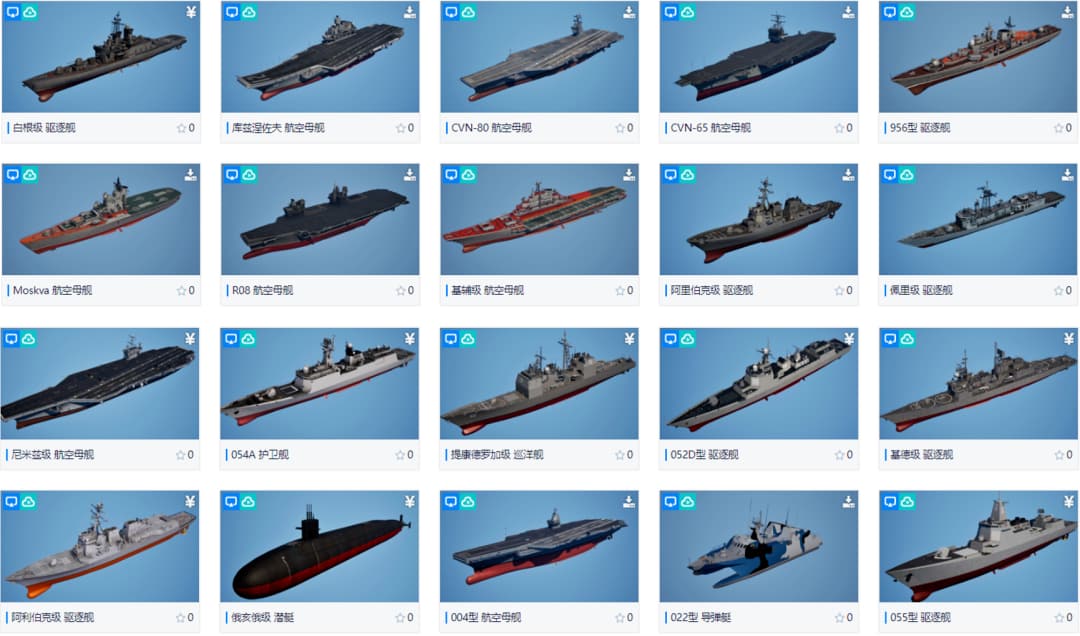 图观商城汇聚多国主流航母模型,包括我国 辽宁舰、福建舰,俄罗斯 库兹涅佐夫航空母舰,美国 CVN - 80(福特级)、CVN - 65(企业号)、尼米兹级,英国 R08、苏联基辅级等。