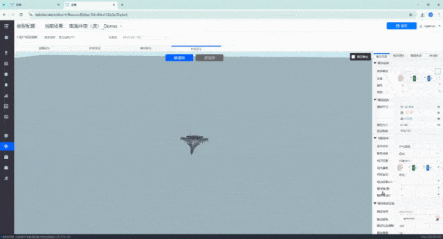(1)所见即所得的位置编辑:可直接导入战场三维场景服务,直接在三维场景中拖拽放置航母、舰载机、护卫舰等孪生体对象孪生体。