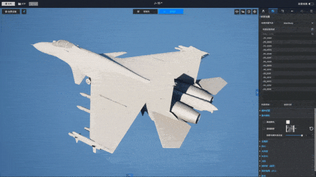 行为上,通过 "关节动画" 实现全流程模拟。起落架收放、襟翼扰流板偏转、发动机状态(如喷口焰效果)等都具备独立的数据驱动接口。模型编辑器允许我们为这些动作定义关节(数值型、布尔型、枚举型),这使得我们可以通过数据精确控制舰载机在甲板上的移动、转向、离舰仰头、爬升等一系列连贯动作。