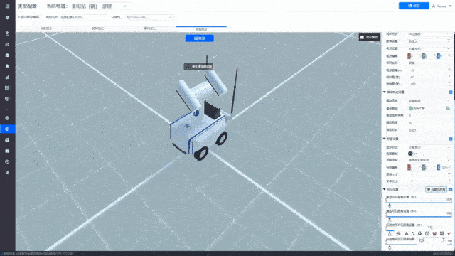 对于巡检机器人 与 通讯基站 间的通讯效果,基于孪易 IOC 平台的通讯链路元类型配置,配置属性字段,以动态光效连线呈现机器人与通讯基站的交互状态,实时显示巡检机器人采集数据的传输路径,从采集端到处理端的完整轨迹清晰可见。