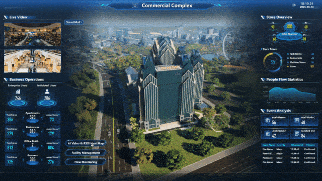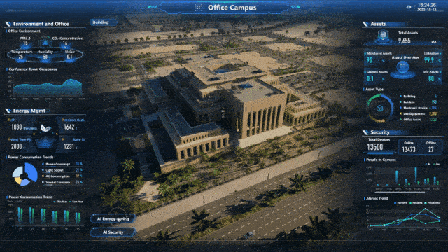 在华为展台的核心区域,数字冰雹带来的智慧园区全场景数字孪生解决方案,构成了本次展示最引人入胜的风景线。该方案并非单一 Demo,而是精心构建了“智慧场馆”、“智慧综合体”与“智慧办公”三大典型场景,以前沿的数字孪生技术为骨架,以 AI 决策为核心,生动演绎了从宏观园区管控到微观场景服务的全方位智能化跃升。