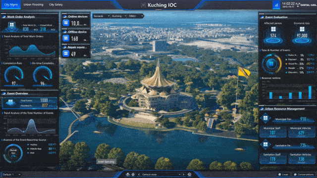 砂拉越地区雨季降水集中,内涝防治是城市安全的重要一环。数字孪生 IOC 能够接入实时气象数据、水文监测数据,并结合城市地形、管网模型,能够动态模拟 暴雨情况下城市各区域的积水情况、淹没范围与演进趋势。这不仅能帮助相关部门提前发布预警、调度排涝资源,更能为城市排水系统的长远规划与改造提供科学依据。