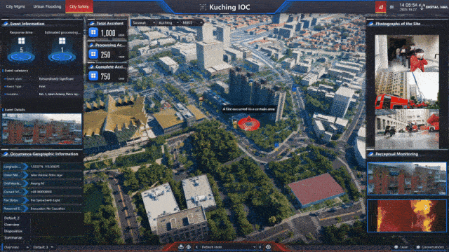 在联合展台上,数字冰雹与华为共同展示的智慧城市 IOC 应用 成为了瞩目的中心。该平台以高精度、全要素的数字孪生技术为核心,1:1复刻了砂拉越的城市风貌、基础设施与动态运行数据,构建了一个虚实映射、实时交互的“城市数字体”。
