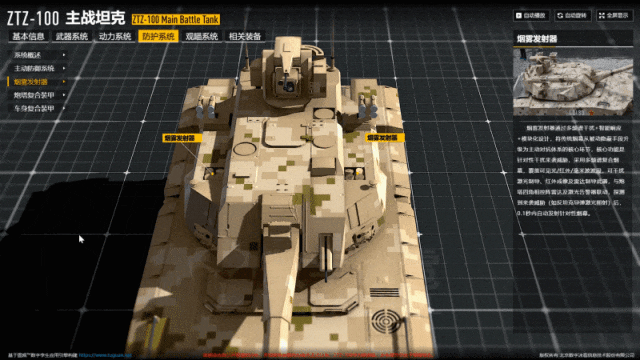当核心技术与家国情怀的碰撞,冰冷的产品平台生长出温度,让精密的模型承载起记忆。ZTZ-100 主战坦克 装备展示应用 基于 图观引擎构建,将物理世界的机械原理与数字空间的渲染技术完美融合,实现了对 ZTZ-100 主战坦克的高精度数字化还原,从外观材质到内部结构,从战术性能到作战流程,将这些先进技术直观呈现。我们在应用中看到的不仅是三维模型,更是一套可交互的 "装甲作战百科全书"。