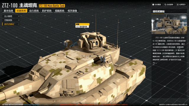 ZTZ-100 主战坦克 的 遥控武器站 配备 12.7 毫米重机枪,车长通过 AR 头盔视线锁定目标,配合 AI 辅助决策系统完成射击流程,可发射编程弹药覆盖中距离集群目标,改进型更能兼容反无人机微波枪,使坦克在复杂战场环境中具备多层次防御能力。