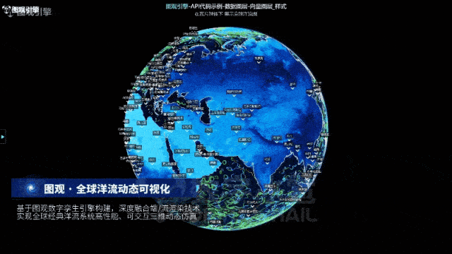 全球洋流的经纬度跨度达 - 180°~180°、-80°~90°,要在三维瓦片地图上精准贴合,就像给地球 “穿衣服”—— 不仅要合身,还要能跟着地球自转、缩放自适应。我们的系统支持大范围坐标系动态适配,从南极冰盖到赤道暖流,每一道粒子轨迹都能与真实地理位置精准对齐。