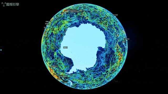 镜头从南极上空俯视,粒子呈环绕南极的连续光环,环绕南极大陆无任何断裂以强劲、连续的轨迹,技术通过大范围坐标系适配,完美还原其连接三大洋的“传送带”功能。