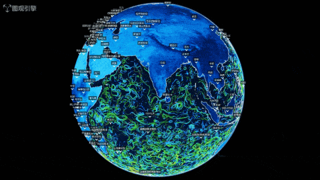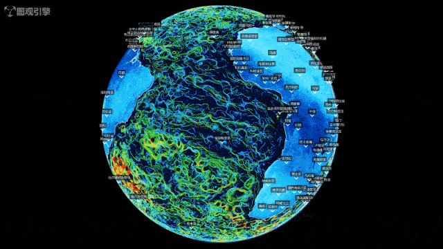 在三维数字地球表面,不计其数的发光粒子循着洋流轨迹奔腾穿梭——从北大西洋涡旋的回旋缠绕,到南极绕极流的绵延浩荡,再到深海底层流的隐秘流动,原本藏在数据深处的全球洋流,终以全维度、实时态的形式完整“显形”。