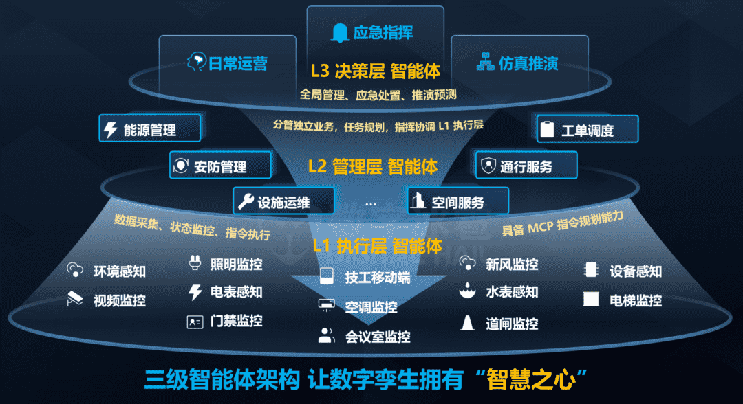- L1 数字员工 直接对接空调、照明、门禁、摄像头等物理设备,负责数据采集与指令执行;