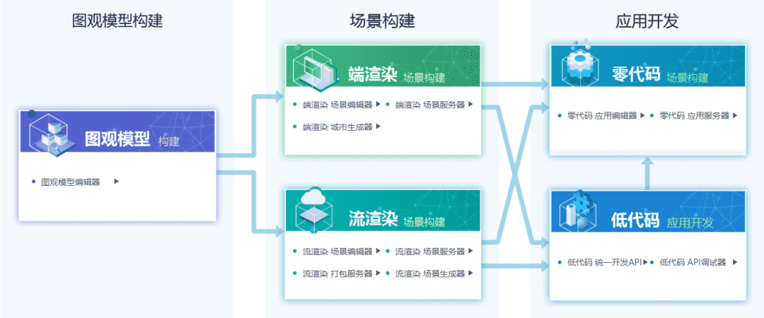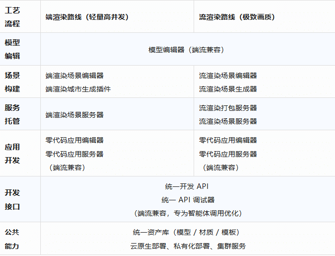 覆盖场景构建、服务发布、应用开发、部署运维全流程,支持端 / 流双渲染模式、零代码 / 低代码双开发路径,以成熟技术体系支撑各类项目快速落地。