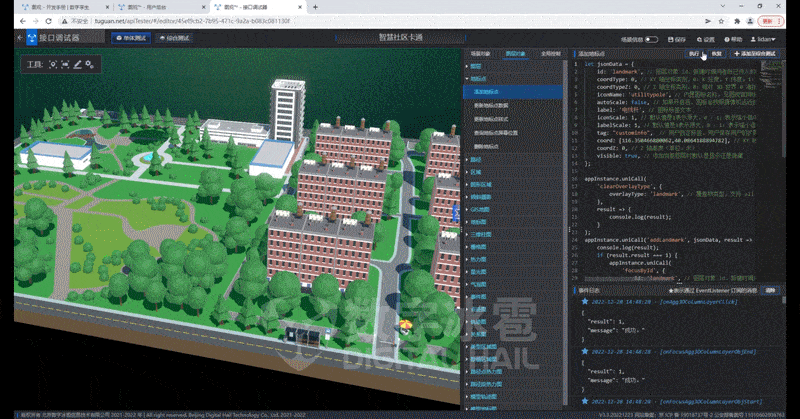 内含 场景服务管理、图层对象绘制与控制、模型对象绘制与控制、特效对象绘制与控制、GIS与倾斜摄影、建筑对象控制、镜头视野控制、交互模式控制、时间与气象控制、多坐标系支持)、大数据聚簇图层等丰富的接口。