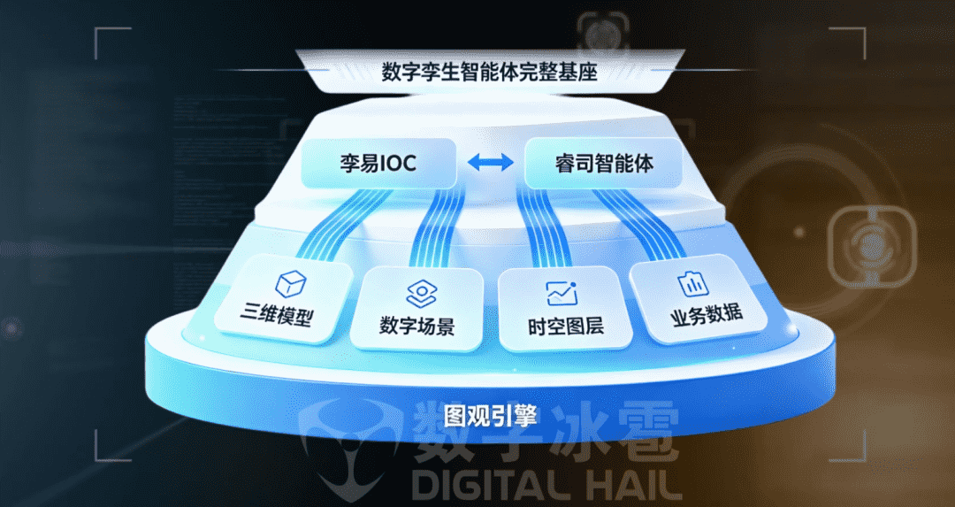 数字冰雹图观引擎与孪易 IOC 、睿司智能体平台 共同构建了智能体产品生态。作为数字冰雹三位一体智能孪生体系的空间基座,图观引擎 为 孪易 IOC 业务中枢与睿司 智能体平台 提供稳定、标准、开放的三维支撑能力:
